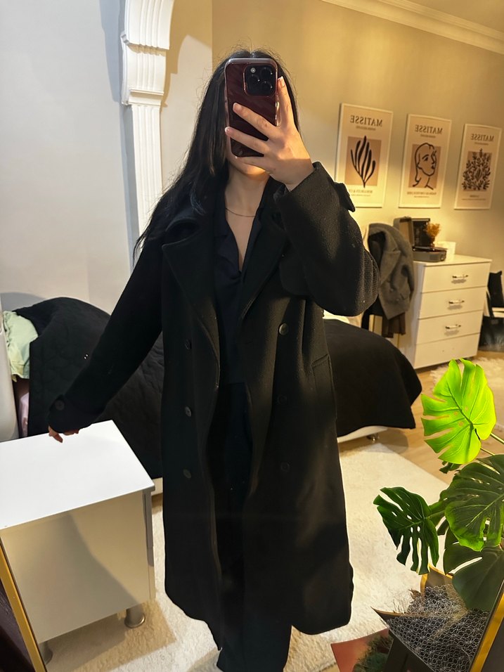 Siyah uzun kadın kaban, çift düğmeli ve klasik yakalı tasarımıyla şık ve zarif bir görünüm sunar. Soğuk havalar için uygundur. S beden kalıbı biraz dar Her hangi bir defosu yok sadace kendi kendine tüylenmiş Astarlıdır Tüylerini temizleyip göndermeye çalışacağım :)