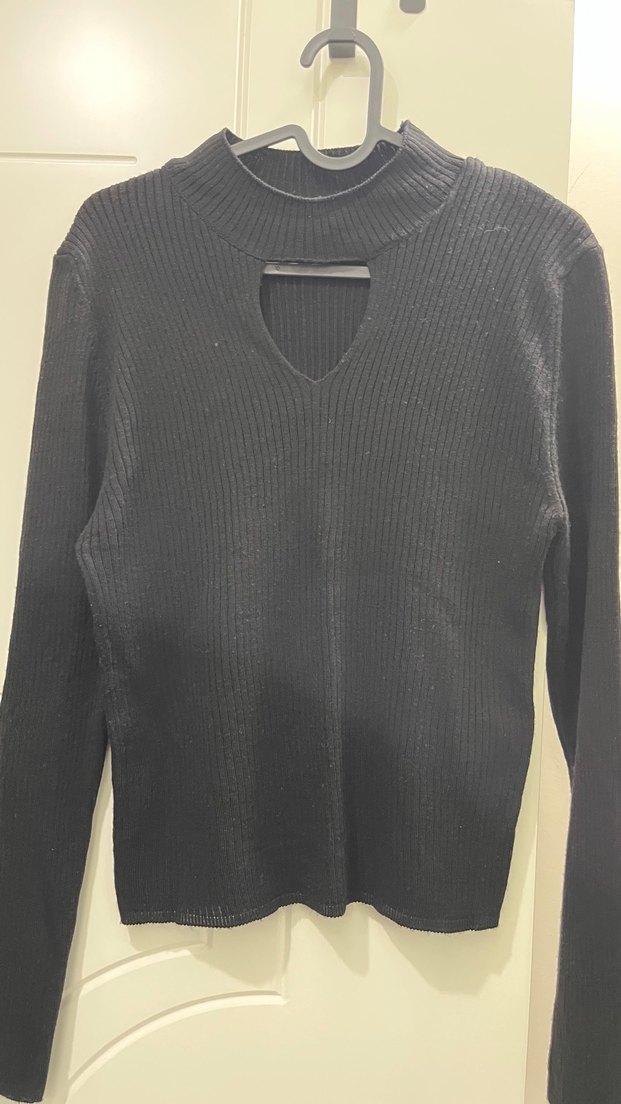 Siyah, ince örgü kumaştan, V yaka kesimli ve uzun kollu, rahat ve şık tarzda günlük kullanıma uygun kadın kazak. Defosuzdur. En 42 cm, boy 55.5 cm’dir.