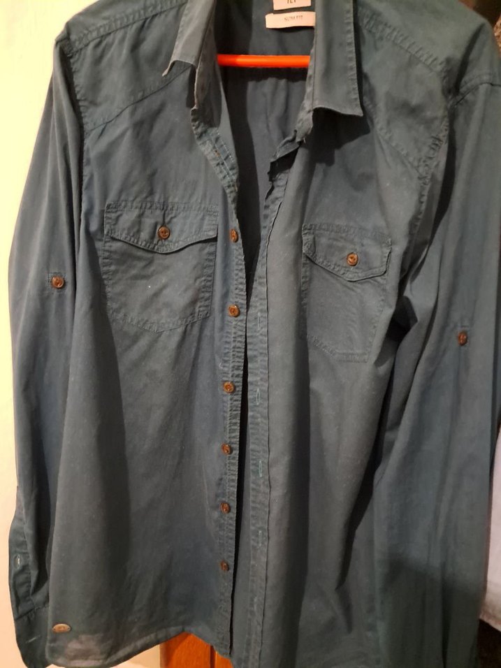Marka: DeFacto (DF Serisi) Beden: Large (L) - Kalıp: Slim Fit (Vücuda oturan dar kesimdir). Renk: Petrol Mavisi / Koyu Yeşil tonlarında. Model: Çift cepli, kolları katlanıp düğmelenebilen spor/safari kesim. Durum Analizi:Ürün kullanılmıştır, yırtık veya sökük yoktur. Kumaş Bilgisi: Kumaşın dokusu gereği, yaka kıvrımlarında, cep kapaklarında ve dikiş yerlerinde yıkamaya/kullanıma bağlı renk açılmaları (yerel beyazlamalar) mevcuttur. Fotoğraflarda detaylıca görebilirsiniz.Bu "eskitme" havası kumaşın kendi karakterinde de vardır.Günlük, spor giyim için uygundur.