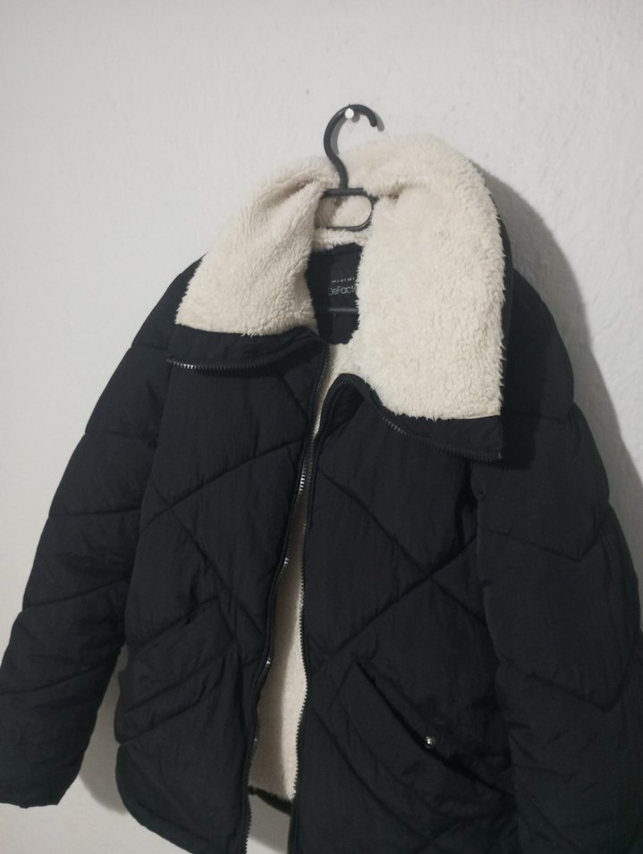 Yüksek yakalı, içi yumuşak kürk detaylı siyah, kısa kesim kadın kışlık ceket. Rahat ve şık, günlük kullanıma uygun. herhangi bir defosu yoktur. s bedendir.