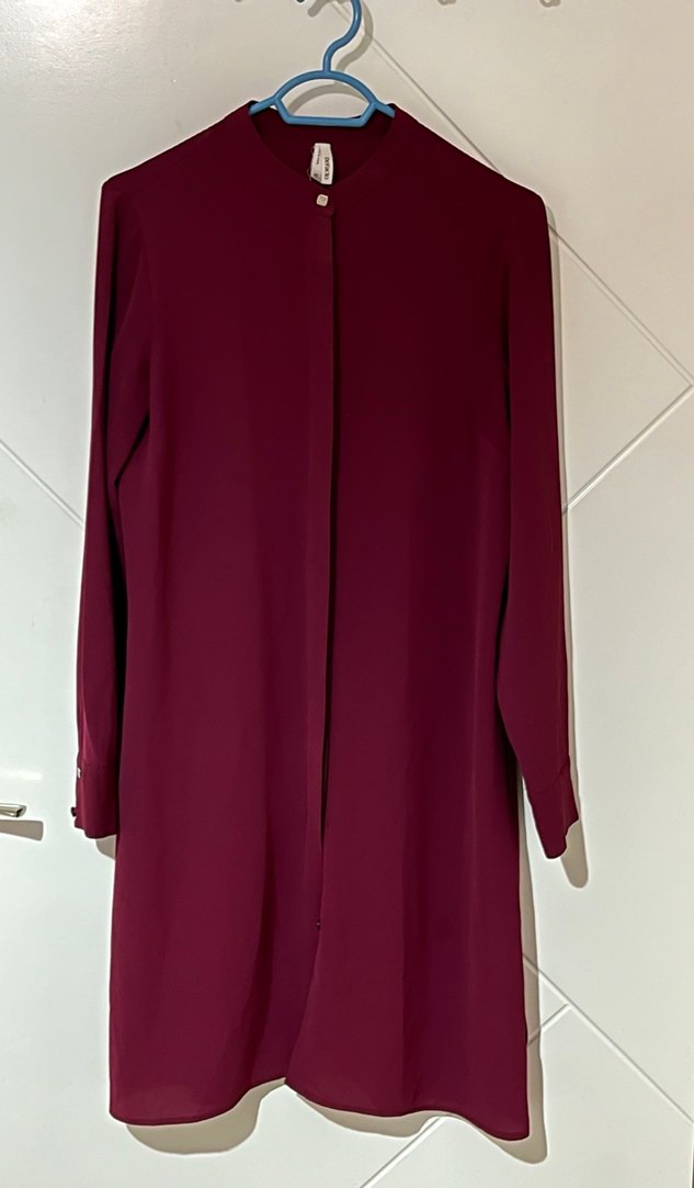 Sadece düğmelerinde renk değişimi vardır.Defosu yoktur.Mürdüm rengindedir.Kalıbı geniş olduğu için s/m bedenlerine de uyumludur.
