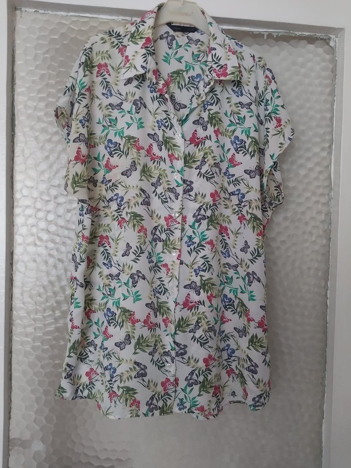 Bohem tarzda, pastel çok renkli desenli, kısa kollu, düğmeli, yakalı, midi boy, bol kesim kadın gömleği. Sadece bir kaç kez giyildi yeni gibi iki kol arası genişlik 52 cm ön boy 67 cm arka boy 73 cm