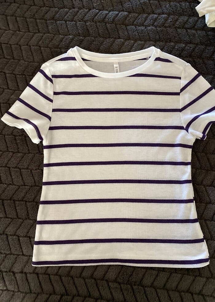 S beden cok az giyilmiş defacto beyaz mor çizgili dar tişört. Vücudu sarıyor.