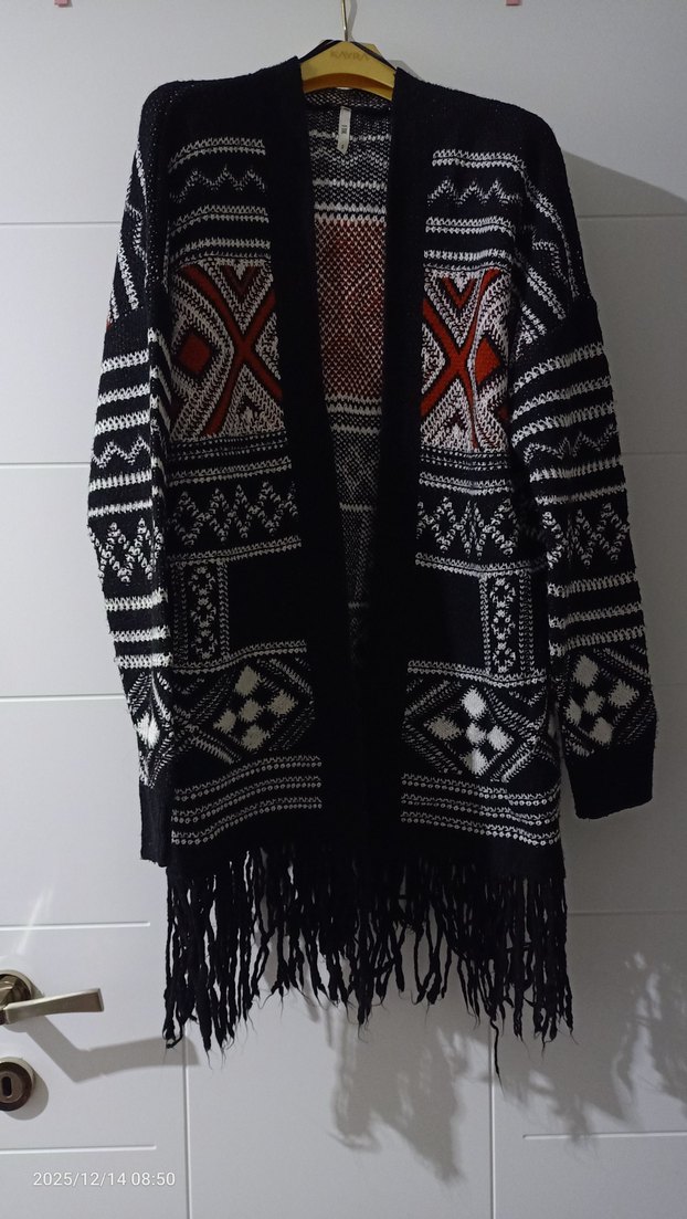 Uzun, bol kesimli, etnik desenli esnek ve kullanımı rahat triko hırka. Uzun kollu, yakası kesik ve püsküllü alt detaylı bohem tarzda, günlük kullanıma uygun. Boyu 75 cm püsküllerle birlikte 90 cm iki kol arası 58 cm . Salaş , esnek S,M,L beden uyumlu. Hediye geldi neredeyse çok çok sayılı kullanıldı. Yeni ayarında