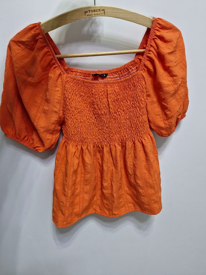 Defacto turuncu Kısa Kollu Pilili Keten Bluz
