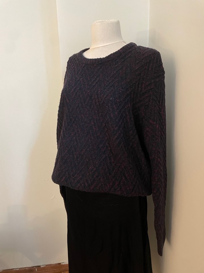 Bordolu siyahlı renkte, yuvarlak yakalı, uzun kollu ve rahat kesim örgü kazak. İki koltukaltı arası 60, boyu 75 cm