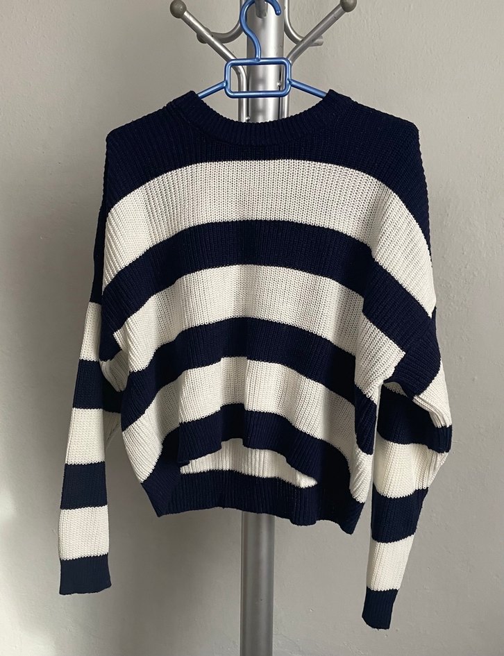 Yeni. Uzun kollu, bisiklet yaka, örme kumaştan yapılmış bol kesim kadın triko kazak. Mavi ve beyaz çizgili desenlidir, günlük kullanım için uygundur.