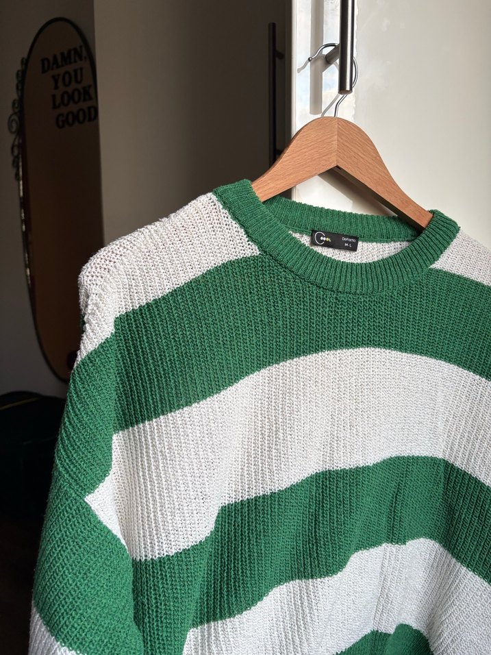 Defacto marka, yuvarlak yakalı, uzun kollu yeşil örgü kadın kazak. Gri baskılı deseni ve rahat kesimiyle günlük sokak stiline uygundur.