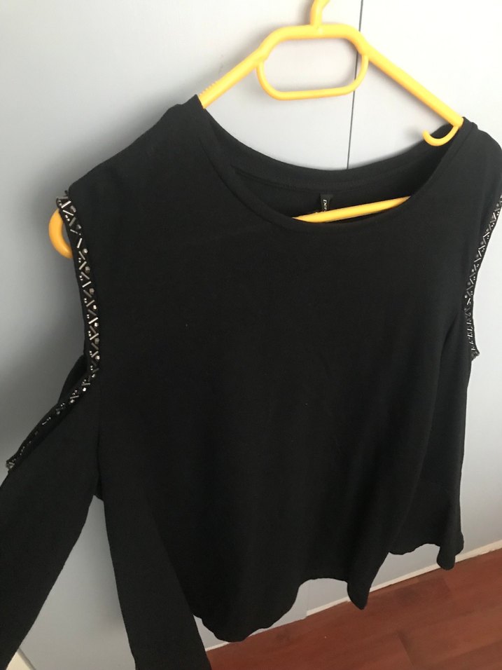 Bu siyah bluz, yuvarlak yaka ve omuzlar açık zincir detaylı uzun valonlu kollara sahiptir. Rahat kesimi ve midi boyu ile sentetik yumuşak kumaştan yapılmıştır,Ölçüm resimde mevcut Hiçbir sıkıntısı yok beden dar geldiğinden satışta İADESİ YOKTUR‼️