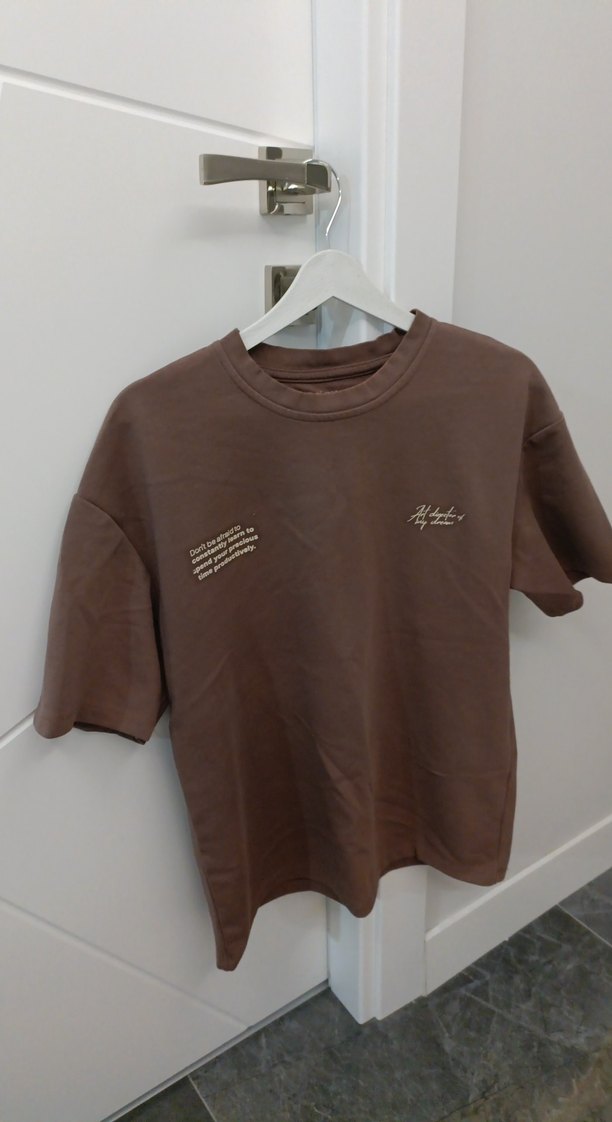 Koyu kahverengi yuvarlak yaka ve kısa kollu, bol kesim boxy fit erkek tişört.