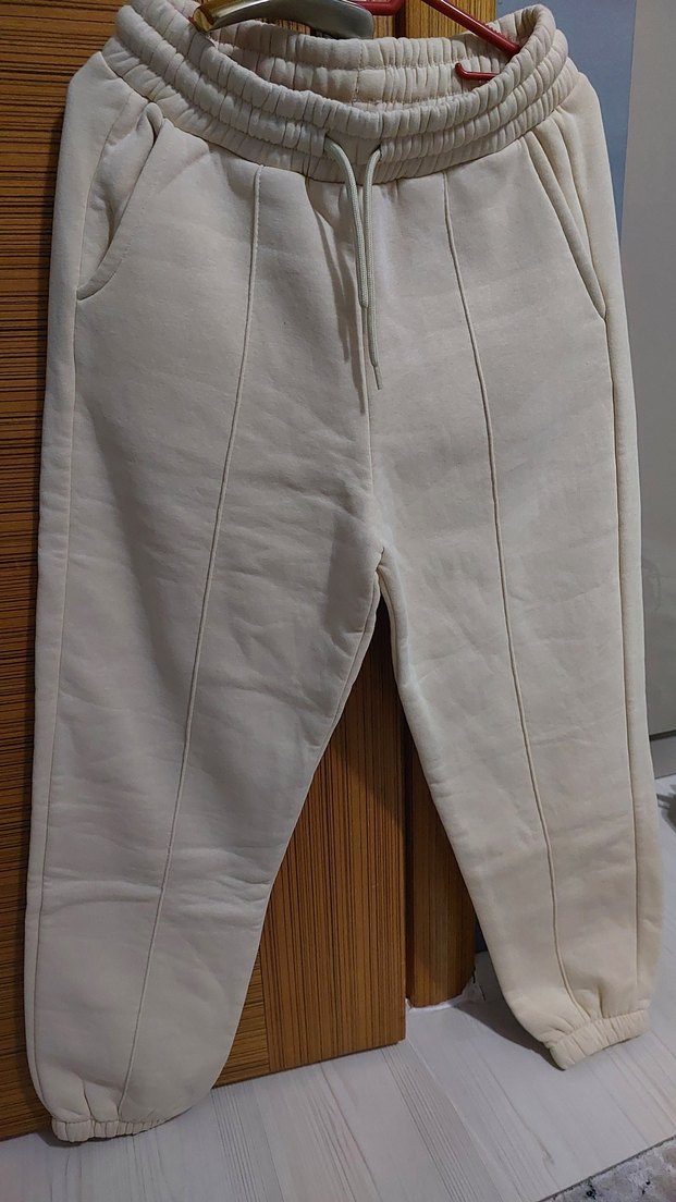 krem i renkli, rahat kesim ve normal boyda, desen içermeyen kadın eşofman altı, yumuşak sentetik kumaştan günlük kullanıma uygun. ✨