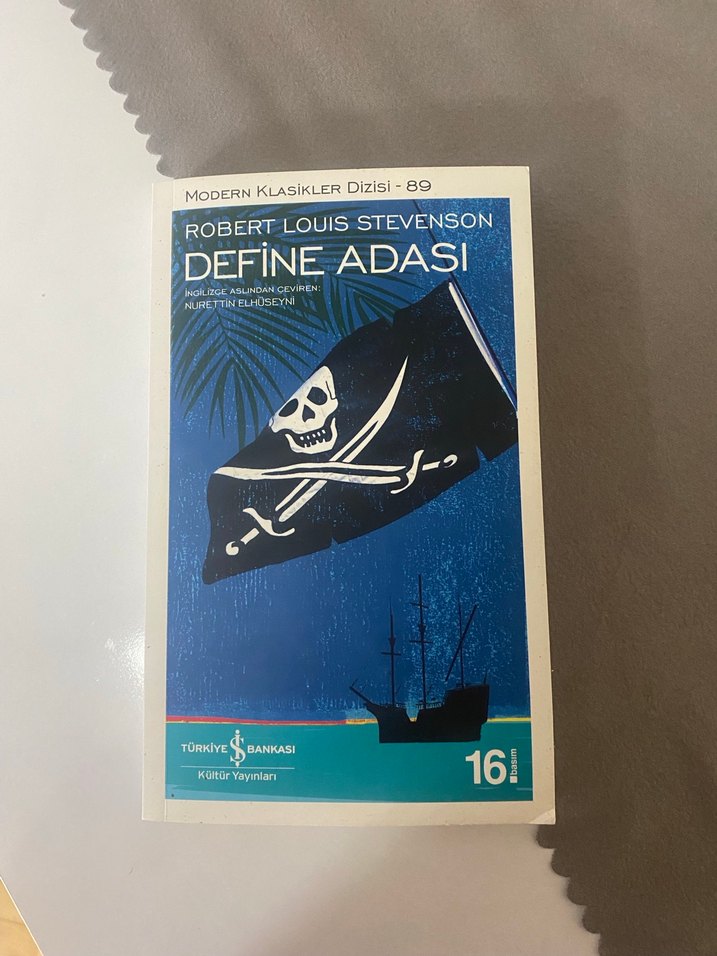 Robert Louis Stevenson'ın "Define Adası" adlı klasik macera kitabı, korsan bayrağı ve gemi görselleriyle hazine avı ve keşfi anlatıyor. ☠️