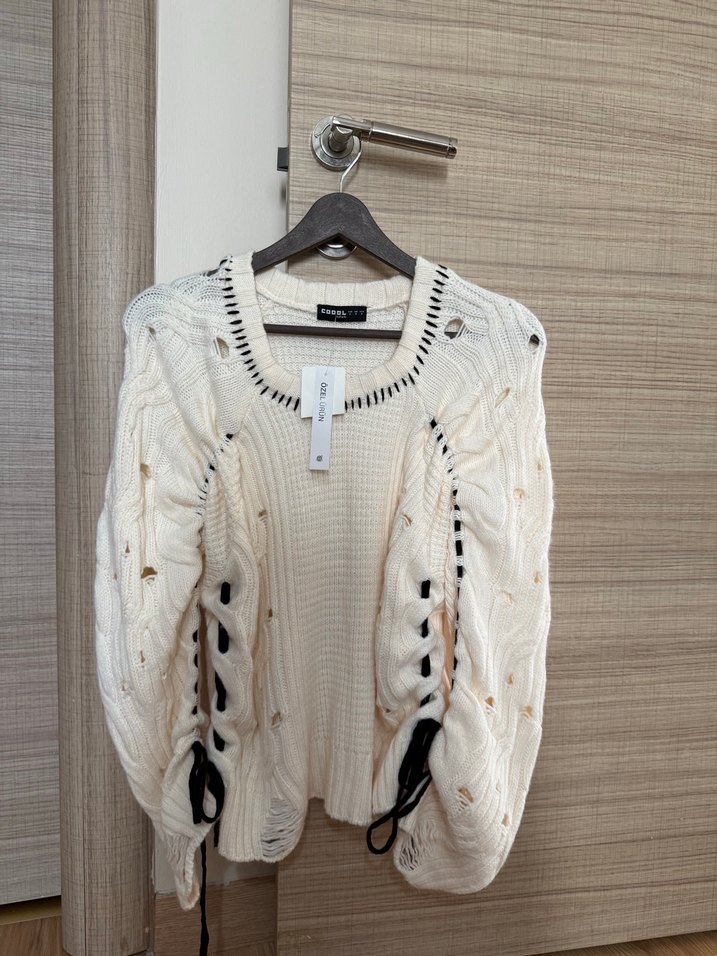 Beyaz örgü kumaştan, nakış detaylı, uzun kollu, yuvarlak yaka ve bol kısa kesime sahip kadın kazak.