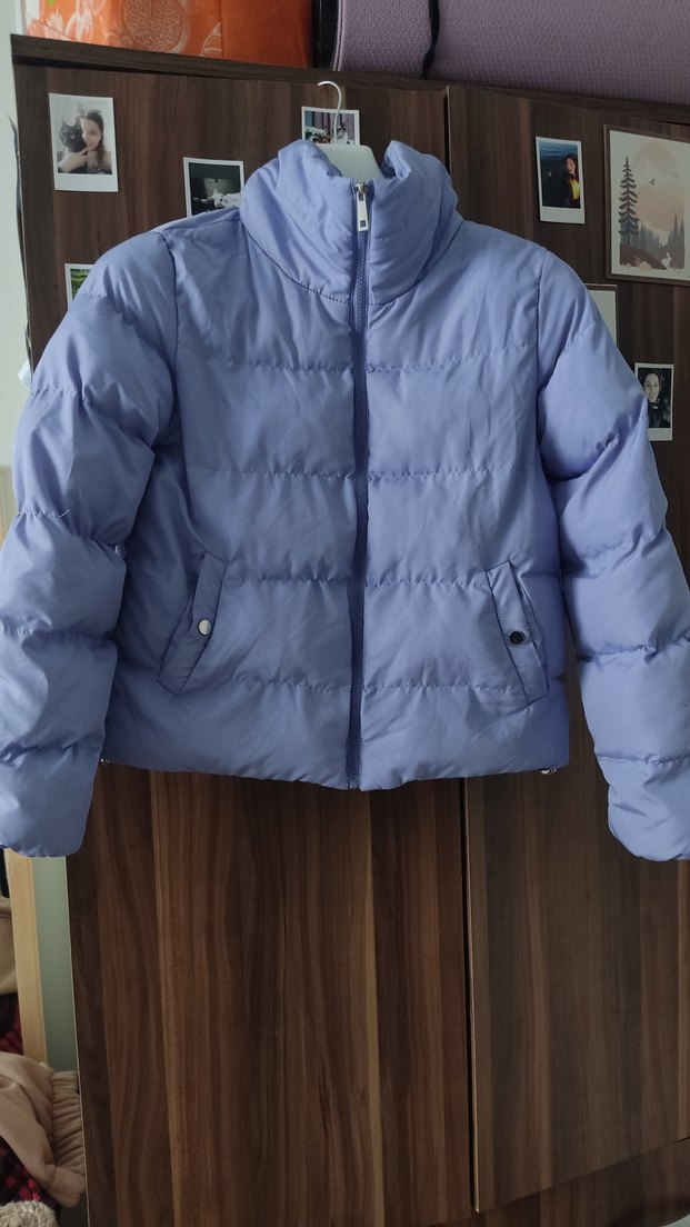 Pastel mor renkte, düğmeli cepleri ve yakası bulunan, rahat ve sıcak kumaştan yapılmış, normal uzunlukta ve uzun kollu kadın kışlık mont. küçük bir leke var kol kısımda fotoğraflardadir