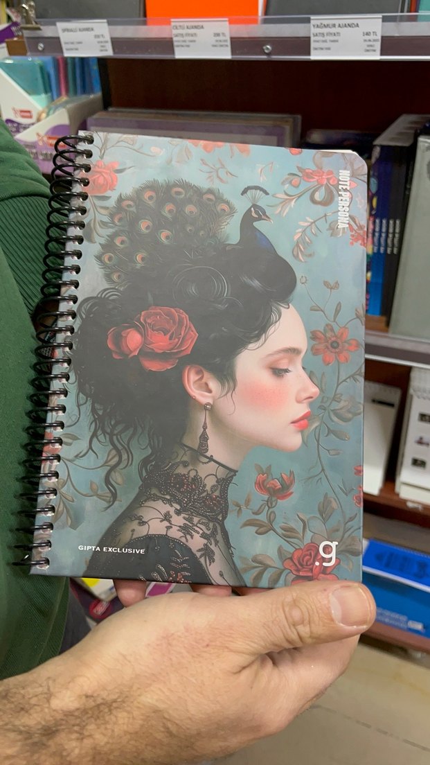 Koyu gri kapaklı, tavus kuşu ve kırmızı güllerle süslenmiş kadın illüstrasyonlu spiralli defter. Kolay sayfa çevirme imkanı sağlar.
