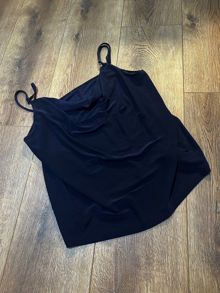 Koyu lacivert ayarlanılabilir askılı degaje yaka bluz L beden için uygundur