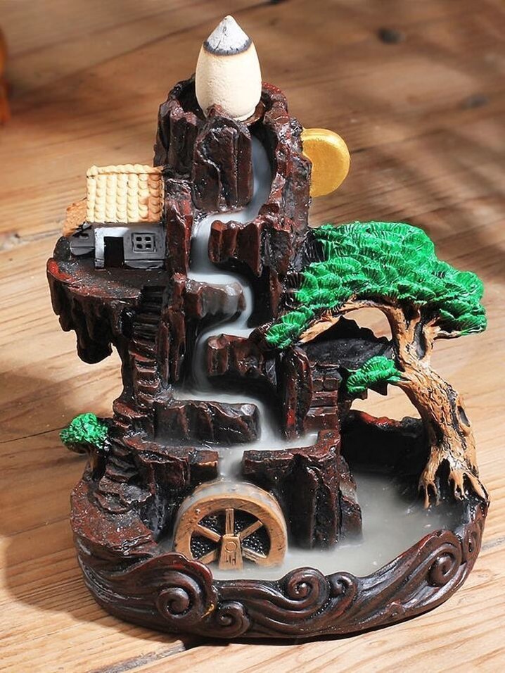 Küçük ev, yeşil ağaç ve su çarkının yer aldığı kahverengi dağ figürini, huzurlu bir doğa manzarası sunar.