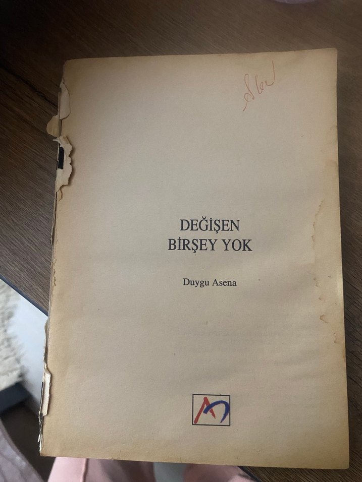 Duygu Asena'nın "Değişen Birşey Yok" adlı şiir kitabı, yıpranmış kapak ve sararmış sayfalarla eski bir görünüme sahip.