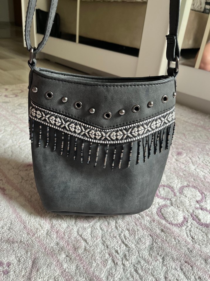 Coachella serisindennn Gri süet çanta, işlemeli desenler, metal çiviler ve püsküllerle bohem tarzda günlük kullanıma uygun.