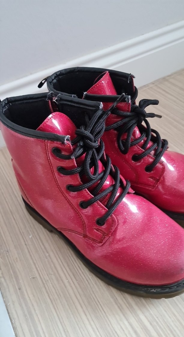Parlak kırmızı bot siyah bağcıklarla gotik tarzda.simli derisi. geçen sene aldık Antalya hava şartlarında 3 ay giydi çocuk.yeni denedik olmuyor satıyorum sorunsuz . ön burun tarafında çok az renk atması var resimledim. giymeye bağlı deforme yok.. ortopedik..