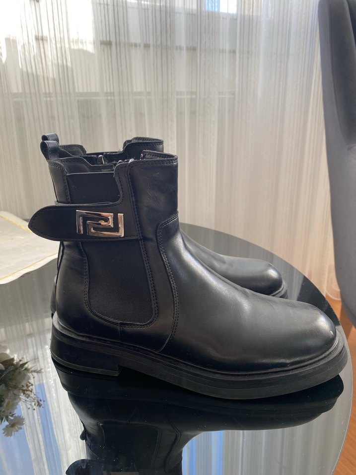 Siyah deri kadın botu, tokalı ve kalın topuklu, günlük kullanıma ve sokak stiline uygun. 37 numara sadece bir iki kez denenmiştir