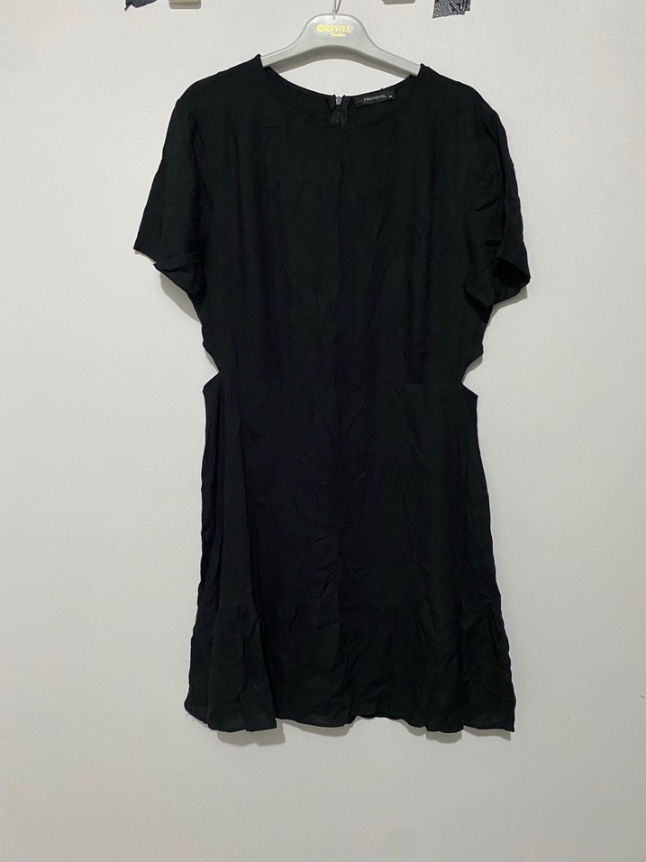 Siyah keten kumaştan, kısa kollu, bisiklet yaka ve dekolteli mini elbise. Minimalist tarzıyla günlük kullanıma uygundur. 1 kez kullanıldı. 42 beden