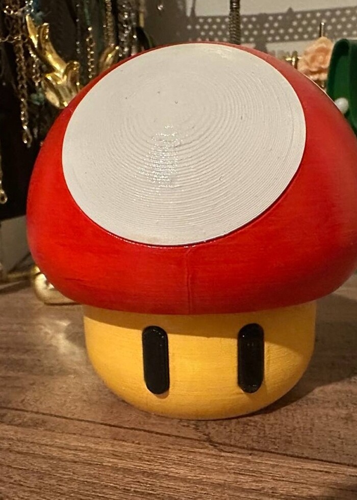 Mısır nişastası PLA+ üretilmiştir. Vidalı kapaklı 3D baskı mario mantar takı kutusu. Takılar için ideal, hediyelik ve çocuk odası dekoru olarakta kullanılabilir. Sağlam, hafif ve el boyaması sevimli tasarım. (içinde bulunan takılar satışa dahil değildir)