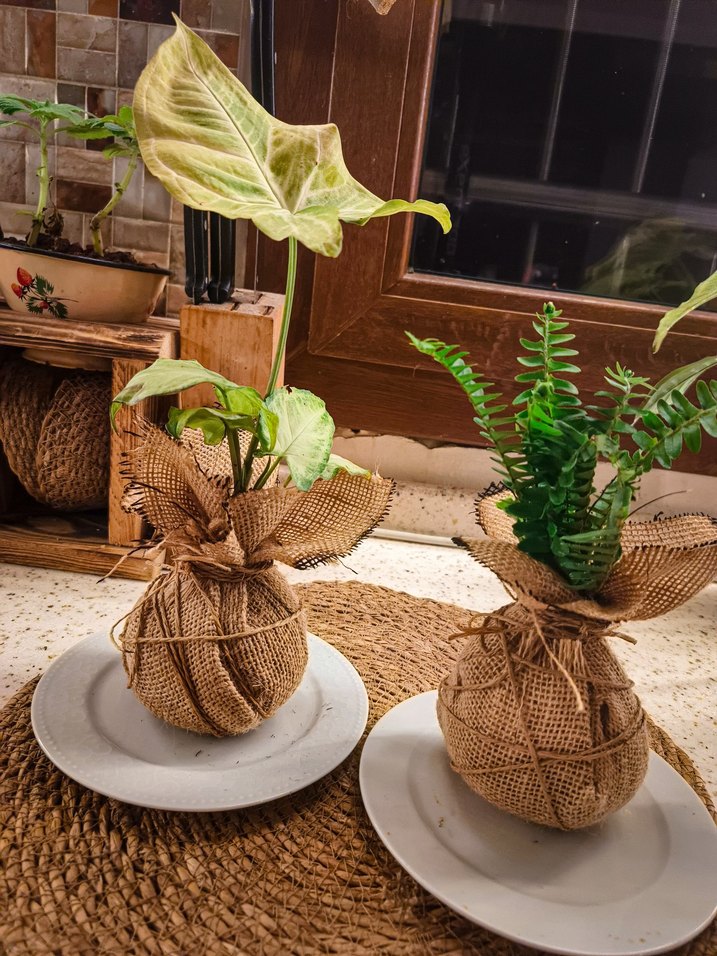 Bu doğal kahverengi hasır saksılar, rustik jüt kumaşla sarılmış yeşil bitkiler içerir, mekana doğal bir hava katar.