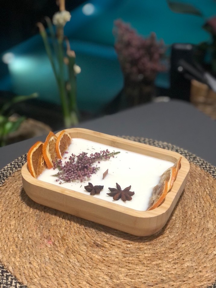 Ahşap dikdörtgen kabında beyaz mum portakal kokulu kuru portakal dilimleri ve mor çiçeklerle süslenmiş. Doğal bir dokunuş katıyor. ️
