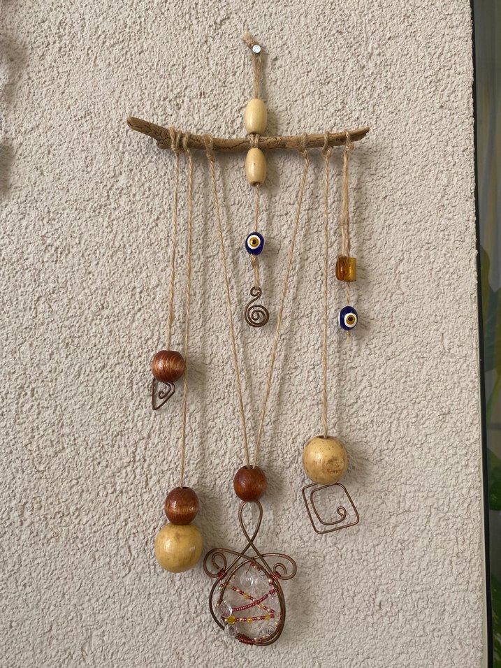 Doğal ahşap ve boncuklardan yapılmış, açık kamel tonlarında koruyucu nazar boncuklu dekoratif duvar süsü. Rustik bir hava katar.