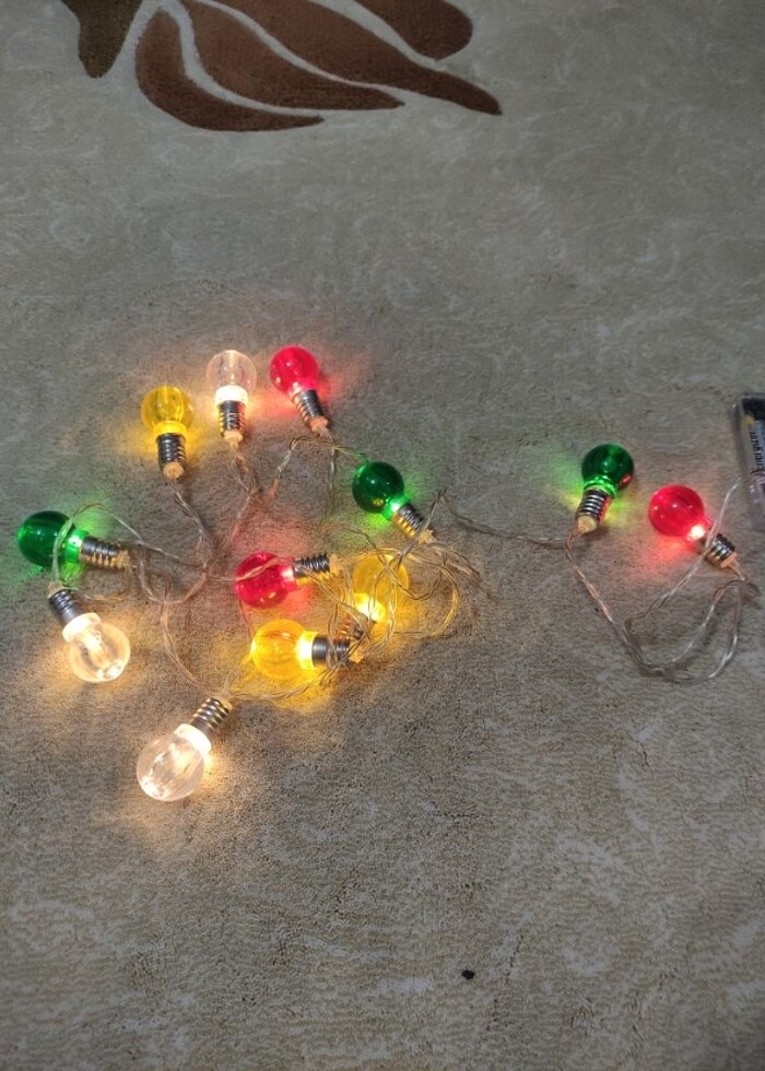 kalın kablolu dayanaklı LED ışıklı bir ürün,aksesuar ampüllü süs aksesuarlı lamba pille çalışır 250 cm civarında uzunluğu marka petrix dir LED ışıklı dekoratif ampüller #yılbaşı konsepti 12 adet ampul var beyaz yeşil kırmızı sarı 4 farklı renkte
