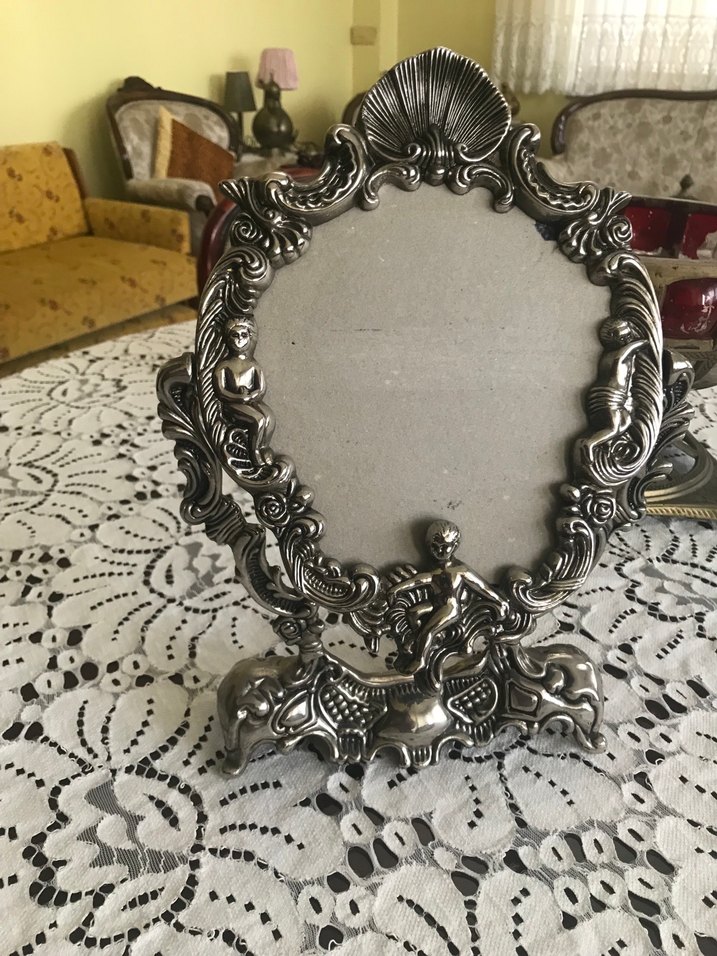 Siyah yuvarlak ayna, süslü metal çerçeve ve ayaklı tasarımıyla vintage bir hava katıyor.