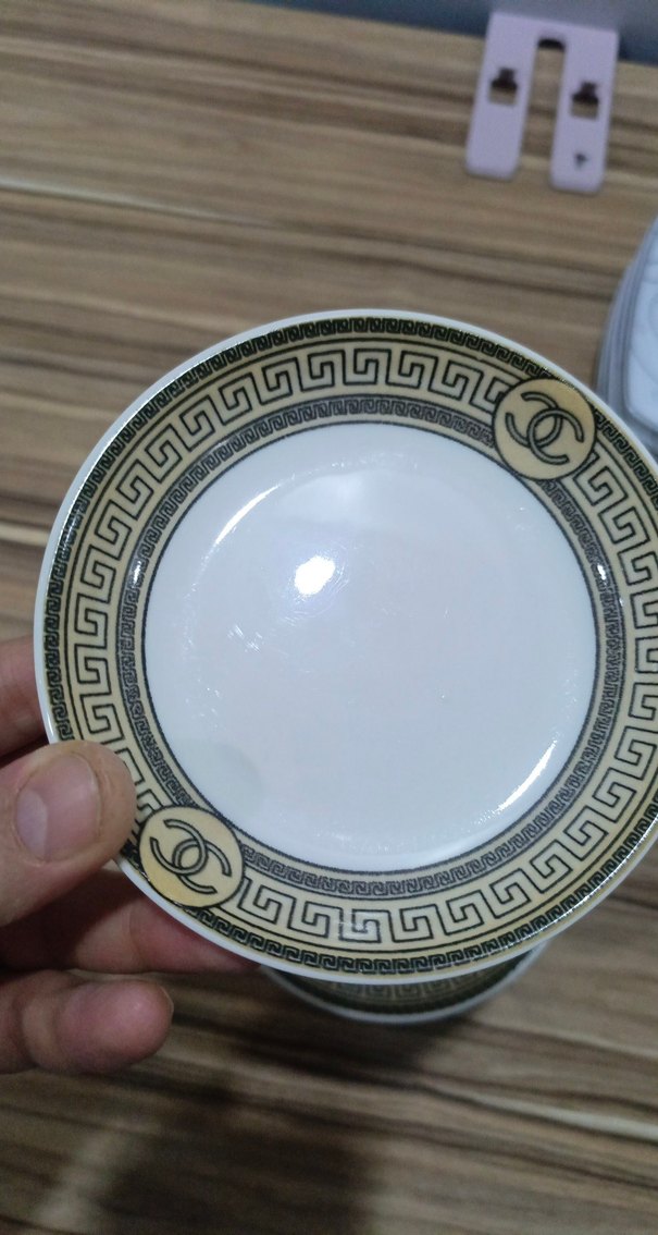 Bu beyaz tabak, şık gri desenli sınır ve logo detaylarıyla yemek sunumu için uygundur. ️