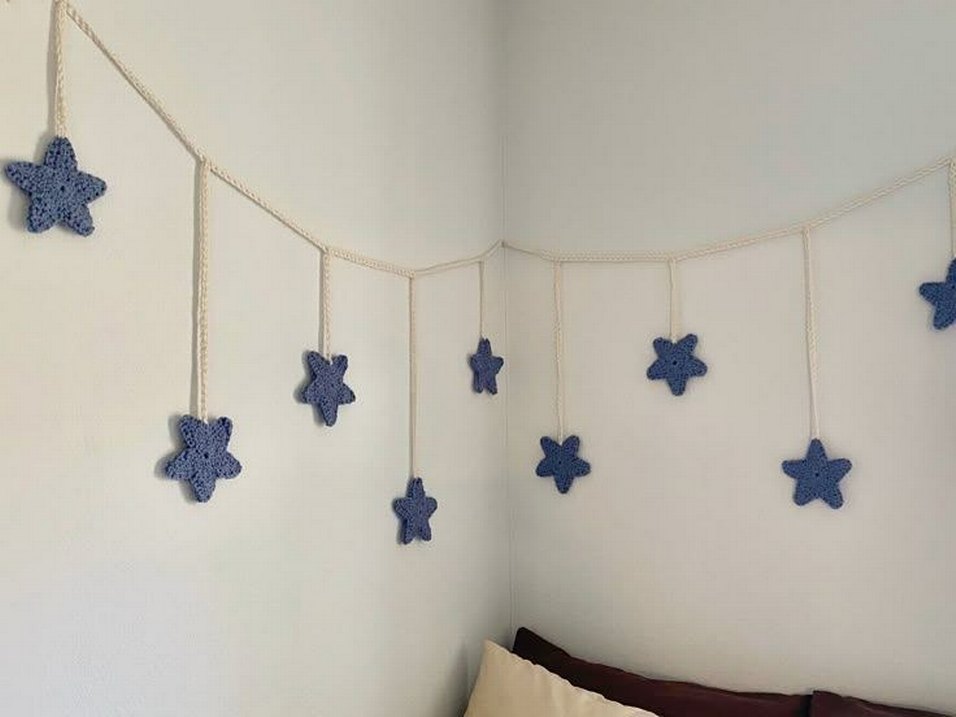Mavi yıldız şeklinde yumuşak malzemeden yapılmış dekoratif duvar süsü, doğal renkli ip ile bağlanmıştır. Odaya renkli bir dokunuş katar.