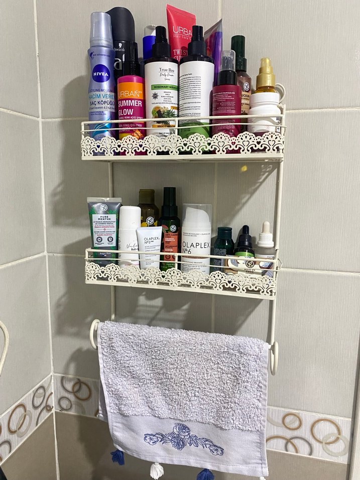 İki raflı, dantel detaylı beyaz kişisel bakım organizeri ve alt kısmında havlu askısı bulunur. Banyo için uygundur.
