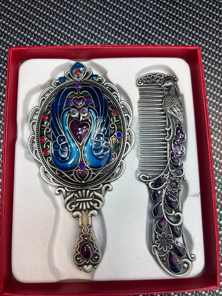 Renkli detaylara sahip, süslü el aynası ve tarak seti,metaryel bakırdır