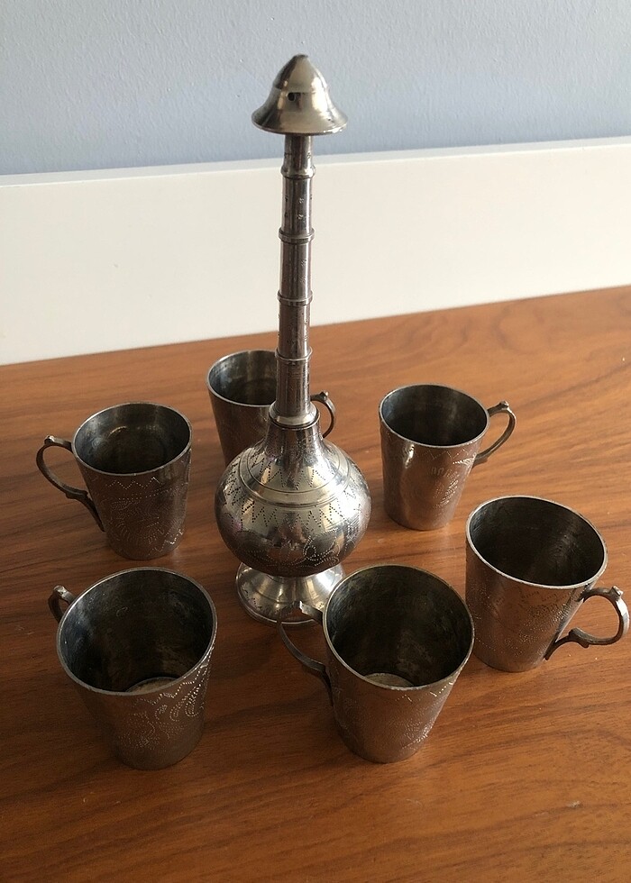 Orijinal antika bakır set altı bardağı ve bir sürahisi var