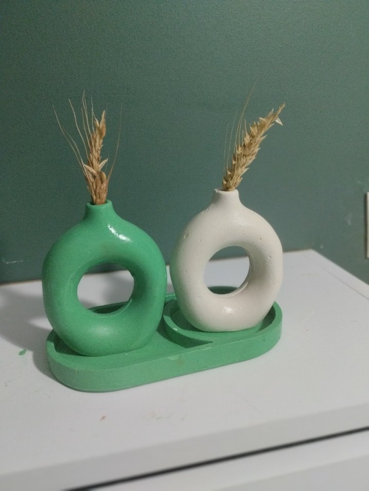 Pastel yeşil ve beyaz renkte, dairesel boşluklu iki seramik vazo, yeşil taban üzer