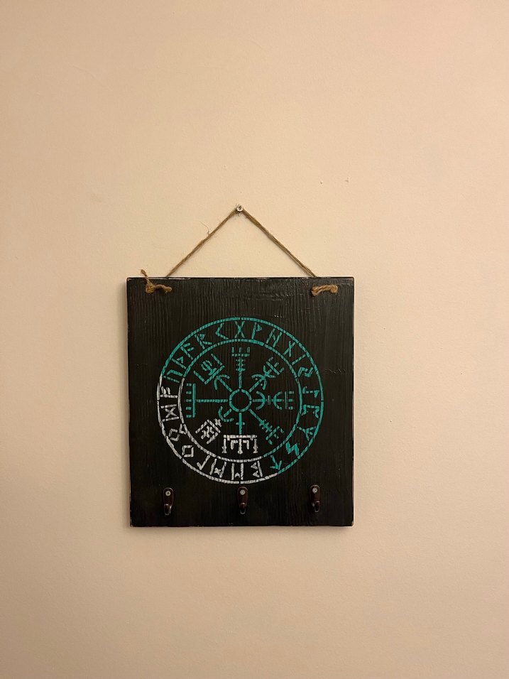 Koyu ahşap üzerinde dairesel İskandinav rünleri tasarımlı, üç askılı ve ipli dekoratif duvar askılığı. El yapımı/Handmade Ölçü; 28 cm * 25 cm Kalınlık; 18 mm Ürün Cinsi; Ahşap 3 Askı