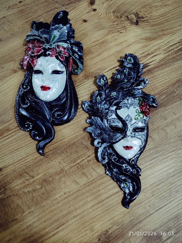 Çiçek ve tüy detaylı, renkli ve işlemeli iki dekoratif kadın maskesi. Duvar süsü olarak kullanılabilir.