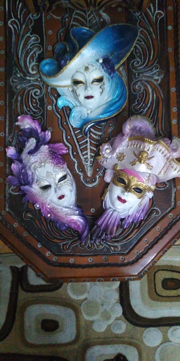 Üç adet dekoratif kadın maskesi, detaylı tasarımlar ve canlı renklerle süslenmiş, sergi veya kostüm kullanımına uygun. Adet fiyatıdır