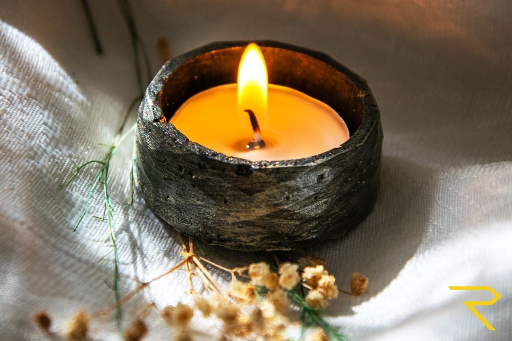 Koyu bej renkte, dokulu ve rustik görünümlü mum tutucusu içinde yanmakta olan bej mum ile sıcak bir atmosfer sağlar. ️ Ürün Ölçüsü: 5x5x2 cm Taş tozundan üretilmektedir.