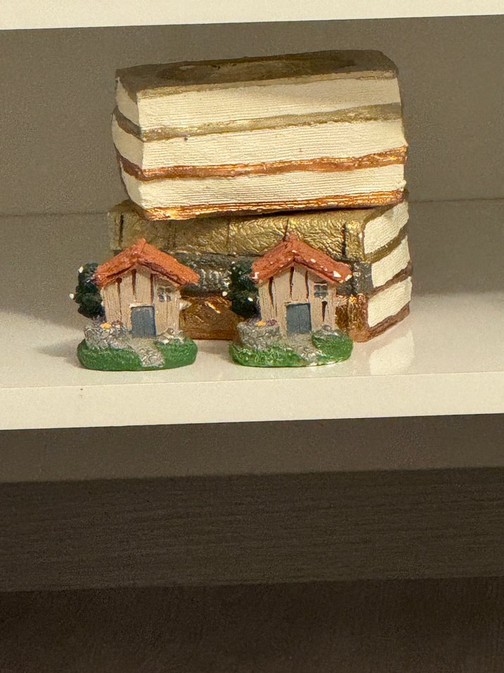 Turuncu çatılı iki küçük ev figürü ve arka planda altın-beyaz çizgili büyük bir blok bulunur. Figürlerin yeşil tabanları ve detaylı dokuları vardır. Ürünler ağırdır.