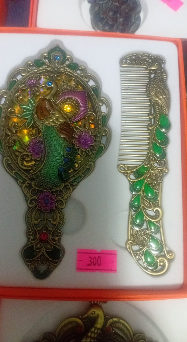 Dekoratif Tavuskuşu Desenli Tarak ve Fırça Seti