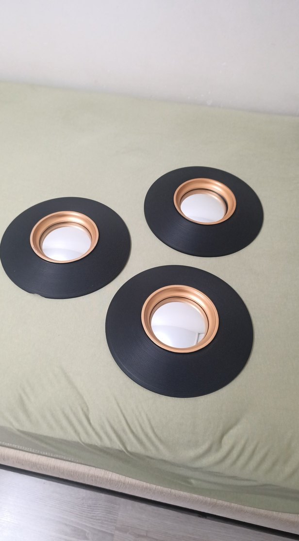Siyah dış çember ve altın iç halka detaylı dekoratif vinil plak aynalar, duvar süslemeleri için uygundur. Ufak kusurları var ama basılınca asla belli olmaz