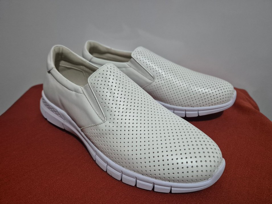 Delikli üst yüzeyi ve gerçek deri ve kauçuk tabanı ile beyaz renkte, günlük kullanıma uygun bayan spor ayakkabısı. Aşırı rahat bir kalıp. Hiç kullanmadım.