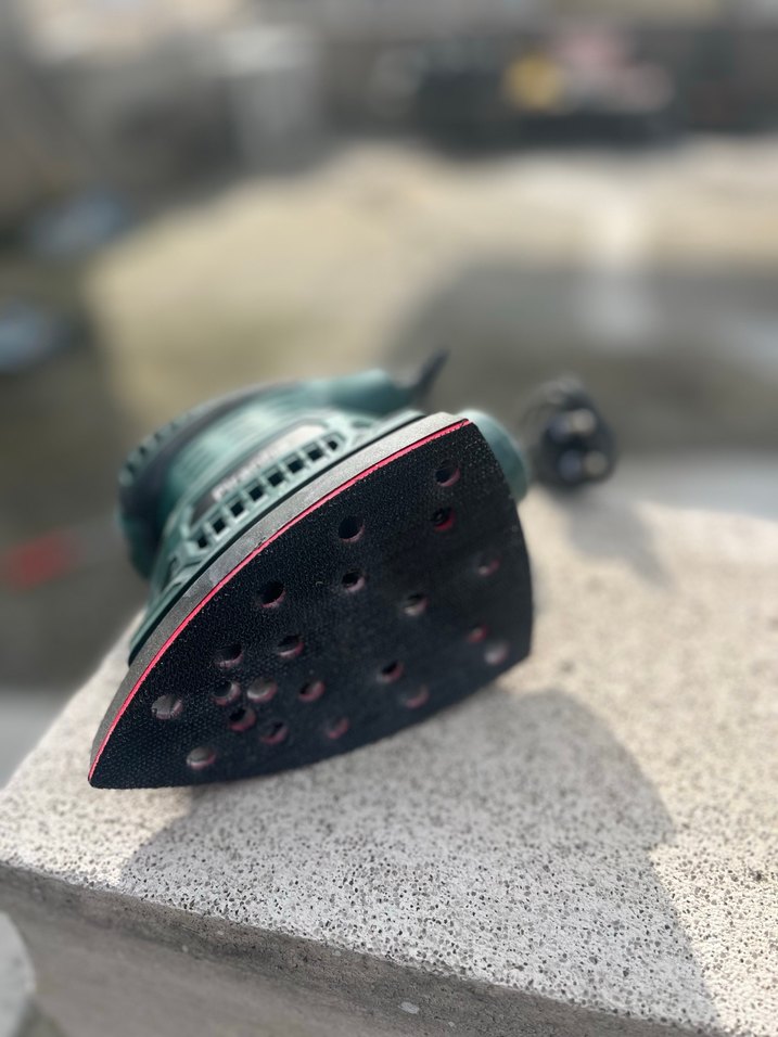 Delikli zımpara pedi ile gri elektrikli zımpara makinesi, toz tahliyesi sağlar ve ergonomik tutuş sunar. ⚙️