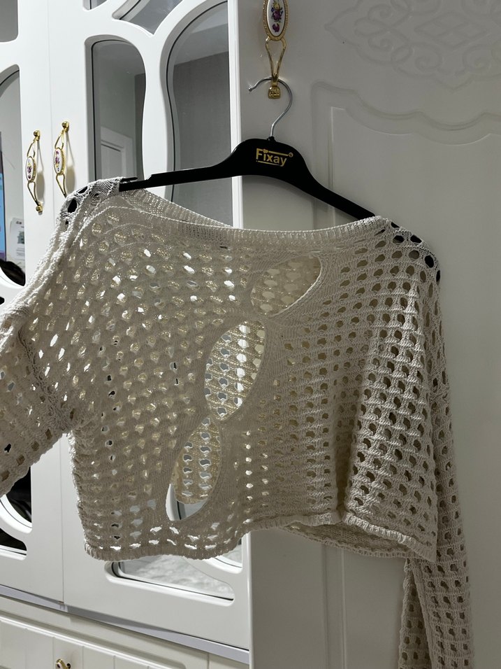 Delikli örgü krem renkli kazak. Önünde yırtık daire modeli mevcut uzun kollu. Yaz kış tüm kombinlere uyum sağlar