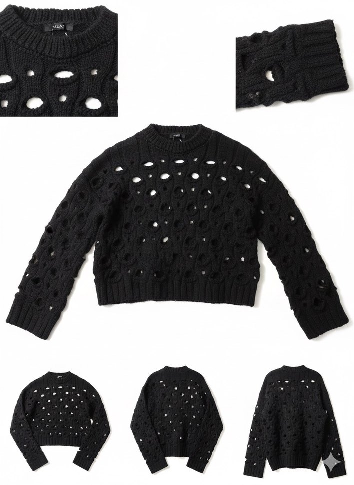 Siyah renkli, delikli örgü detaylı, yuvarlak yakalı ve uzun kollu, bol kesim kadın kazak. Gotik ve avangart tarzı yansıtır.