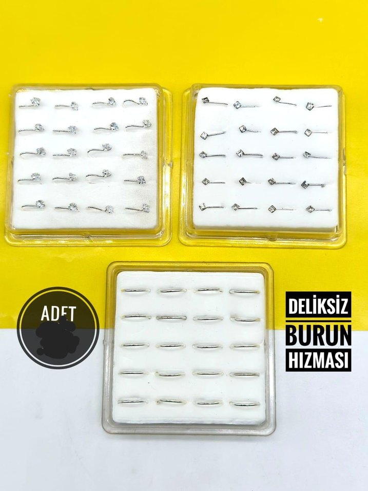 Deliksiz olarak kullanılabilen renkli beyaz burun hızması seti. Farklı tasarımlar içerir. Üzerinde BURUN, HIZMASI, ADET, DELiKSiZ yazıları bulunur.